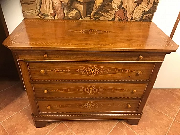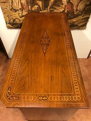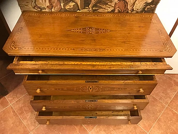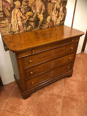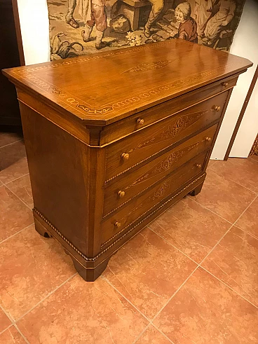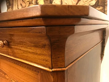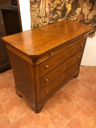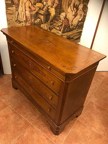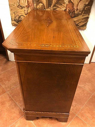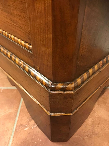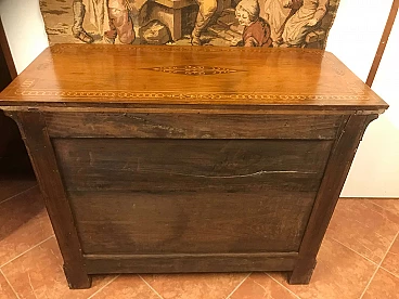 Comó Carlo X piemontese intarsiato in acero su noce con riserve lastronate, originale primi '800