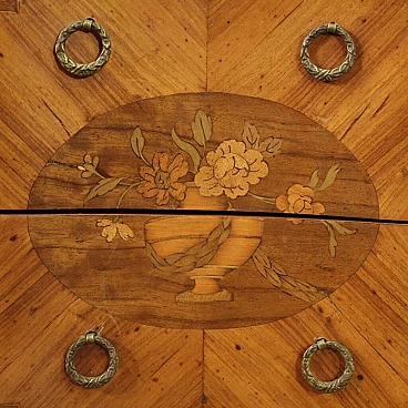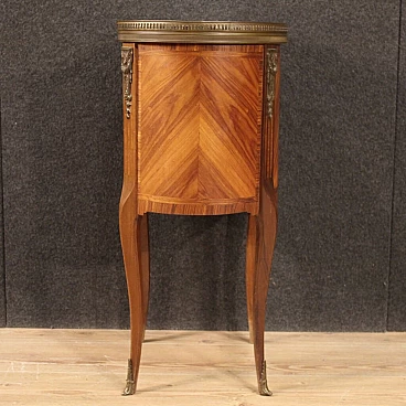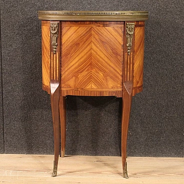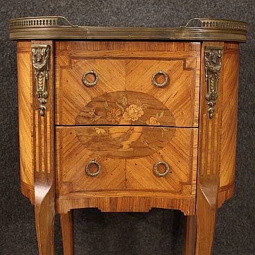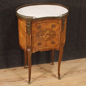 Mobiletto francese della metà del XX secolo. Mobile finito da centro intarsiato in legni di noce, bois de rose, acero, mogano e legni da frutto in stile Napoleone III. Tavolino munito di piano superiore in marmo originale con ghiera in ottone cesellato di buon servizio. Comodino munito di due cassetti frontali di buona capacità adornato da decori in bronzo cesellato (vedi foto). Tavolino di ottima proporzione, facilmente inseribile in diversi punti della casa, per antiquari e arredatori. In buone condizioni con qualche piccolo segno del tempo.