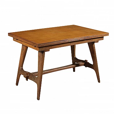 Tavolo allungabile con prolunghe a scomparsa, in legno impiallacciato e massello di rovere. Prodotto in buone condizioni, presenta piccoli segni di usura.