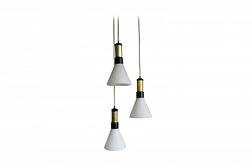 Lampadario prodotta da Stilnovo Milano con vetro opalino, ottone e metallo smaltao, anni 50. L'altezza totale del lampadario può essere variabile a seconda dell'atezza dei fili.
