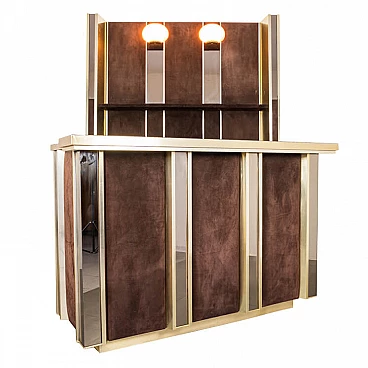 Mobile Bar disegnato e progettato dal designer Willy Rizzo. Questo articolo è stato attribuito grazie a documenti d’archivio, come cataloghi vintage, documenti del designer, o altre fonti letterarie. Struttura in acciaio cromato e alcantara scamosciato marrone. Frigo Bar perfettamente funzionante. Luci in vetro opalino con inserti in ottone. Design anni 60. Buone condizioni generali, ma presenta segni del tempo, come da foto. Misure: Larghezza Bancone 149,5 cm Profondità Bancone 63 cm Altezza Bancone 98 cm Larghezza Struttura posteriore 145 cm Profondità Struttura posteriore 18,5 cm Altezza Struttura posteriore 196 cm
