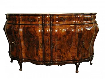 Credenza modello bombato in radica di noce Stile rococò veneziano Vintage Epoca 1930 -60 Modello sagomato, listrata in radica di noce Quattro ante, ripiani interni, quattro cassetti Piedi a massello intagliati, serrature e chiavi. Il mobile di ottima qualità è stato costruito da maestri falegnami veneti su modello veneziano del “700. Ottime condizioni generali, vernice originale rivisitata. Misure max ingombro: L. 193 P. 60 H. 108 cm