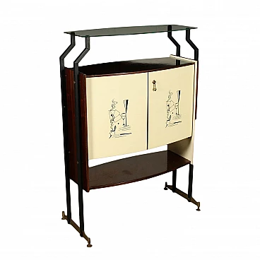 Mobile bar in legno impiallacciato mogano, ante laccate con finitura al poliestere, mensola in vetro e gambe in metallo. Mobile in buone condizioni, presenta piccoli segni di usura.