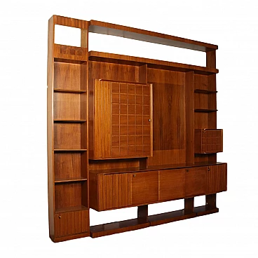 Mobile da soggiorno con elementi contenitori ad ante e ripiani a giorno, in legno impiallacciato palissandro. Mobile in buone condizioni, presenta piccoli segni di usura.