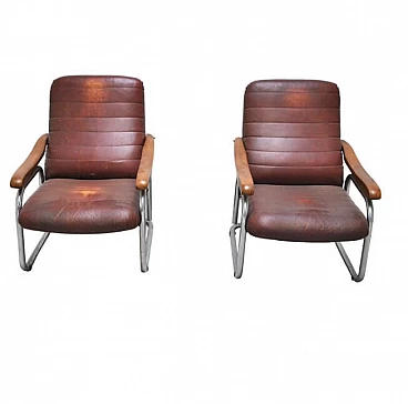 Coppia di poltrone in stile Bauhaus in acciaio e pelle, anni '50