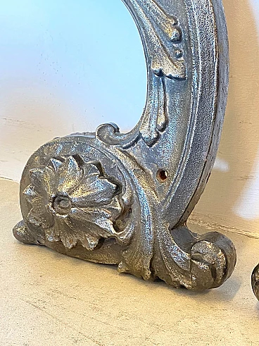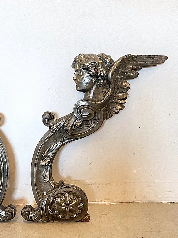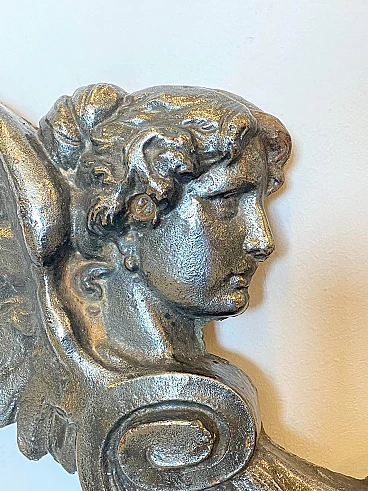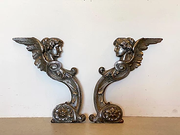 Coppia di elementi decorativi rappresentanti figure alate in ghisa, anni '10