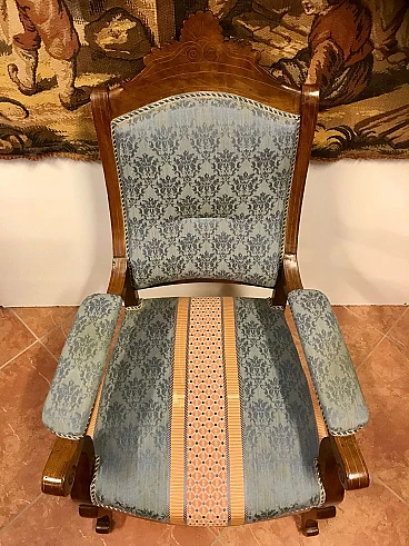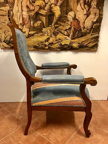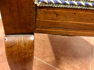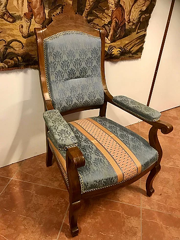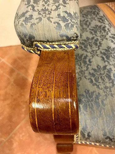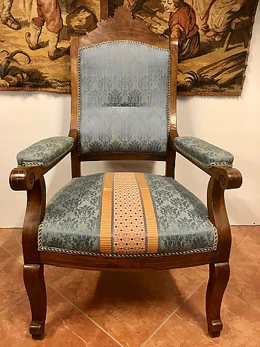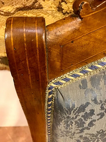 Poltrona Lombarda Carlo X in noce filettata ed intarsiata in acero, rivestita in tessuto, originale primi '800