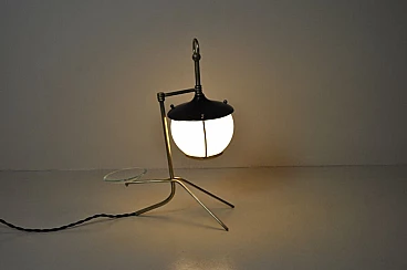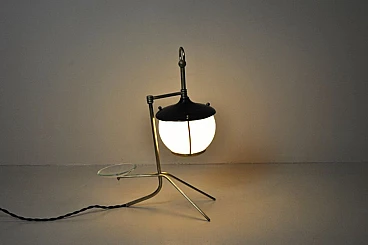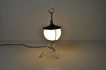 Lampada da tavolo a forma di lanterna in ottone, ferro e vetro opalino, anni '50