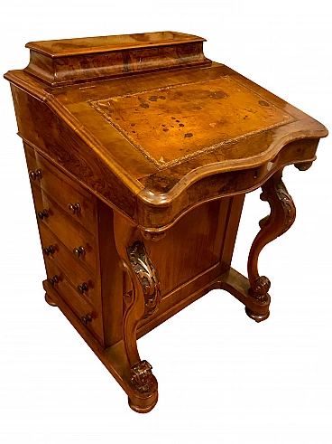 Elegante scrittoio Davenport in legno di noce e radica con piano inclinato rivestito nella parte centrale in pelle apribile, con all'interno tre cassetti (due alti finti). Poggiante su 4 ruote perfettamente funzionanti, ha nella parte alta un ulteriore vano ad urna, apribile, con interno a scomparti. Parte destra a quattro cassetti funzionanti; parte sinistra a quattro finti cassetti. Parte frontale a due sostegni a doppia voluta intagliati in legno di noce. Mobile da centro rifinito in tutte le sue parti. Stile ed epoca vittoriana, Inghilterra, originale '800. Lo stato di conservazione è buono , il mobile necessita di alcuni piccoli interventi. La pelle del piano e con segni del tempo. I 16 pomelli sono tutti presenti ma alcuni sono stati sostituiti nel tempo. Le serrature dei 2 vani sono presenti con i propri meccanismi e tutte originali, le serrature dei 4 cassetti sono tutte presenti, 2 originali e 2 sostituite nel tempo.
