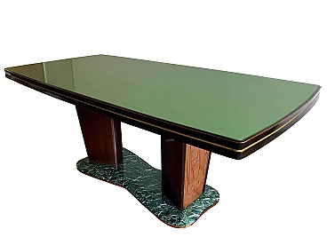 Per la vostra considerazione questo elegante tavolo da pranzo in stile Art Déco, disegnato da Vittorio Dassi negli anni '50. Il piano-tavolo ha il retro in vetro trattato con carta colorata verde ed è sorretto da due grandi gambe fissate su un basamento in pregiato marmo delle Alpi, entrambe sono decorate sui lati esterni da due pannelli con bassorilievi scolpiti. Le sue condizioni originali dell'epoca sono da considerarsi molto buone, con lievi segni di usura compatibili con l'età e l'uso delicato, ed è pronto all'uso. Qui, in un altro annuncio, questo Tavolo è in vendita accompagnato anche dalle sue Sedie originali (set di 8), come vi mostrano le immagini.