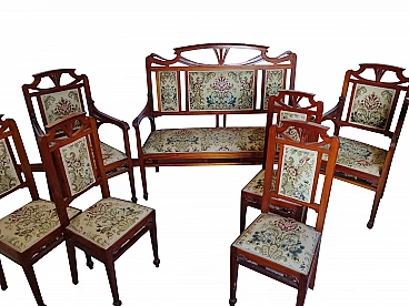 Set da salotto Liberty composto da divano, coppia di poltrone, 4 sedie e vetrina, anni '30