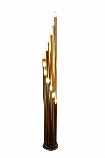 Lampada da terra a spirale in metallo ottonato con 12 punti luce attribuita a Goffredo Reggiani. La lampada è in ottime condizioni e perfettamente funzionante. Sono presenti segni di ossidazione e screpolatura sulla base.
