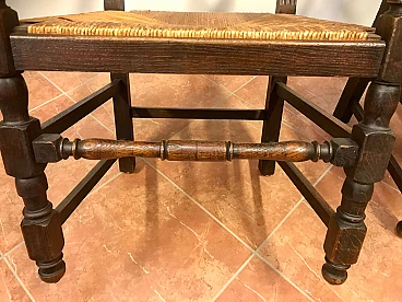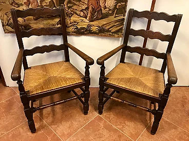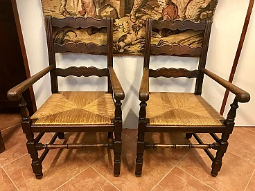 Coppia di Poltrone Capotavola scolpite in legno di rovere con seduta originale intrecciata in paglia, stile Luigi XIII, epoca '800