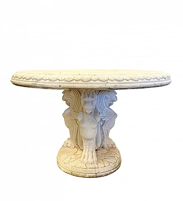 Tavolo da giardino in cemento anni 70, base formata da tre leoni alati che sorreggono il piano circolare