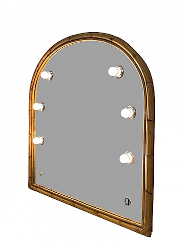 Specchiera anni 70 luminosa in bambù, 6 luci, presa elettrica e variatore luce.