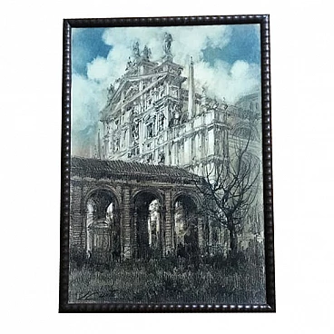 Matita grassa e acquarello su carta Santa Maria presso San Celso (Milano) firmata Luigi Curti (1899-1990).