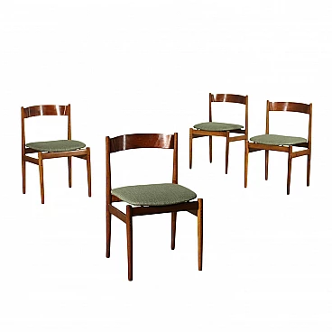 Gruppo di 4 sedie in legno di faggio tinto, seduta imbottita in espanso e rivestimento in tessuto. Prodotto in condizioni molto buone che può mostrare lievi tracce di usura, può aver subito interventi di restauro effettuati da un esperto. Altezza seduta: 46cm.