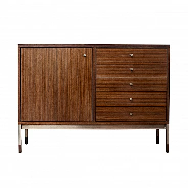 Credenza in palissandro, con base in metallo e piedini in legno. Modernariato italiano anni ‘60. Perfette condizioni con lievi segni e patina del tempo. Uno di tre pezzi di un unico set; possibilità di acquisto dell’intero set.