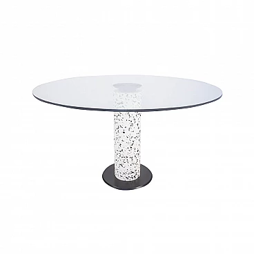 Tavolo da pranzo rotondo con piano in vetro spesso 1,5 cm, struttura in pietra. Base in metallo. Buone condizioni, con lievi segni dovuti al tempo e utilizzo.