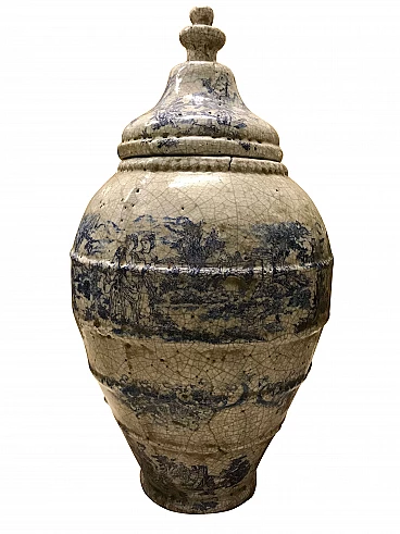 Grande Vaso completo di coperchio di fattura italiana della metà dell’800 in Terracotta ricoperta di Ceramica bianca dipinta in blu con scene galanti e paesaggi e Vetrificata. Lo stato di conservazione è buono, non ci sono rotture, ma solo segni e piccoli fori dovuti a questo tipo di cottura che caratterizzano questo imponente Vaso.