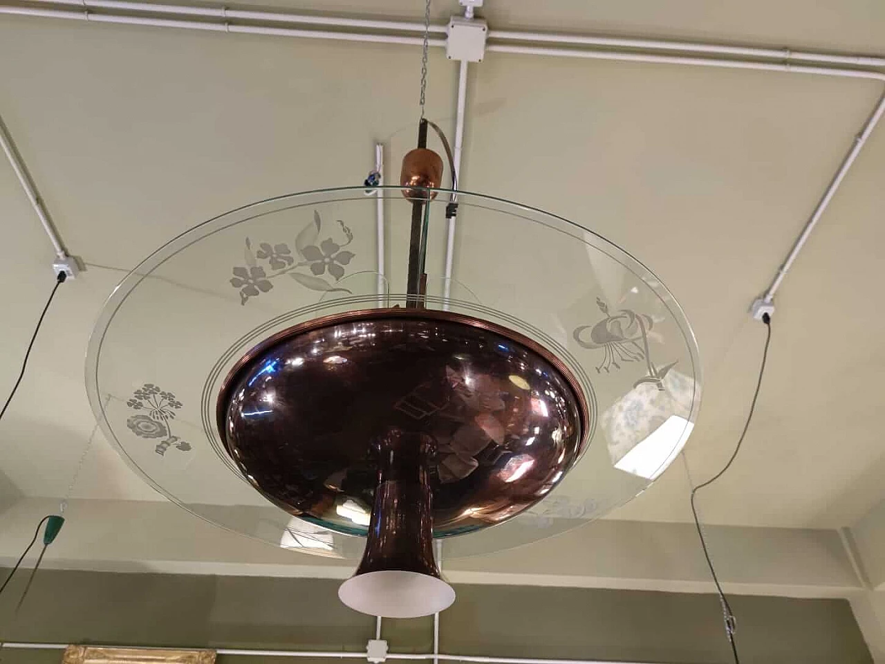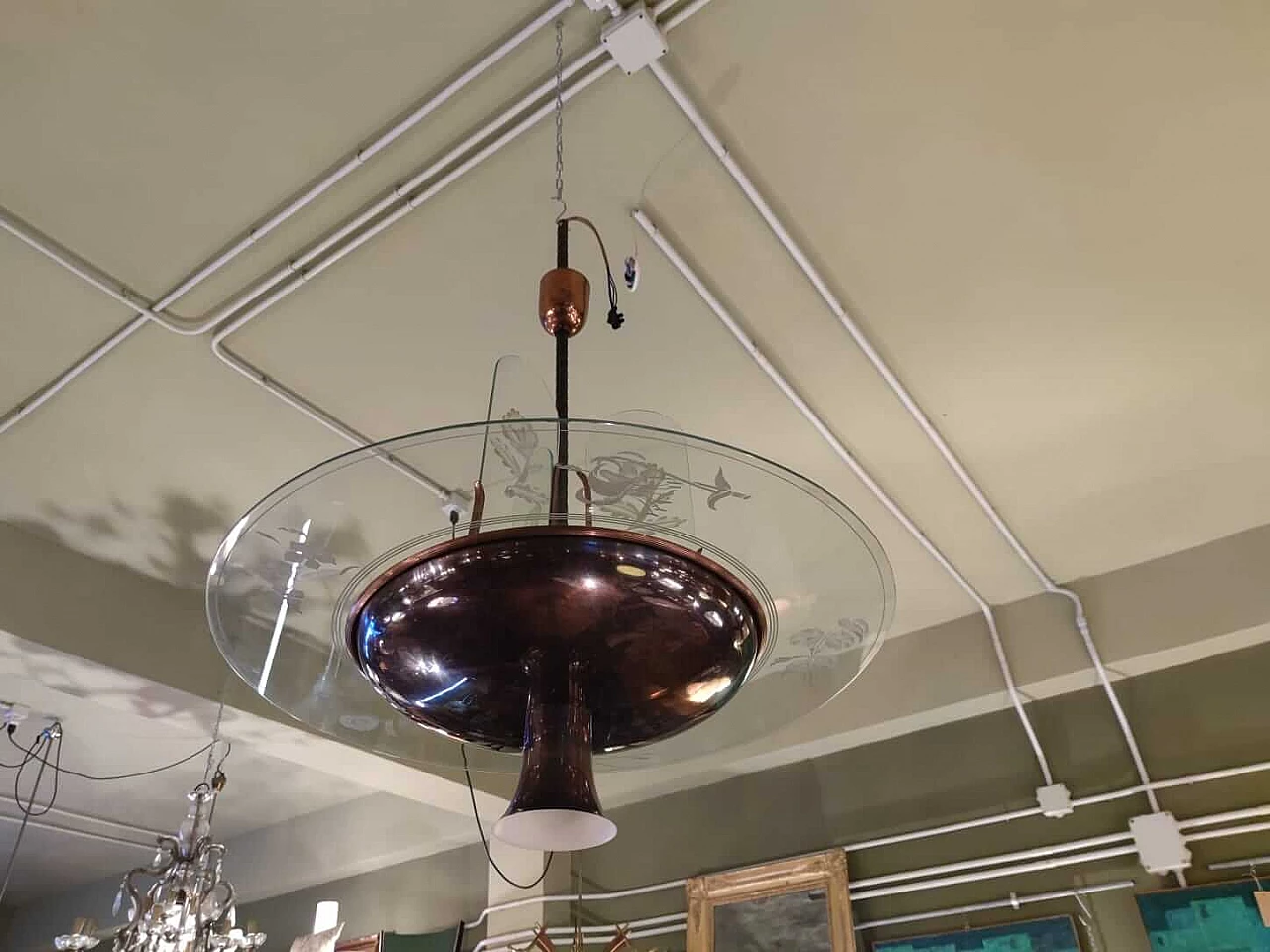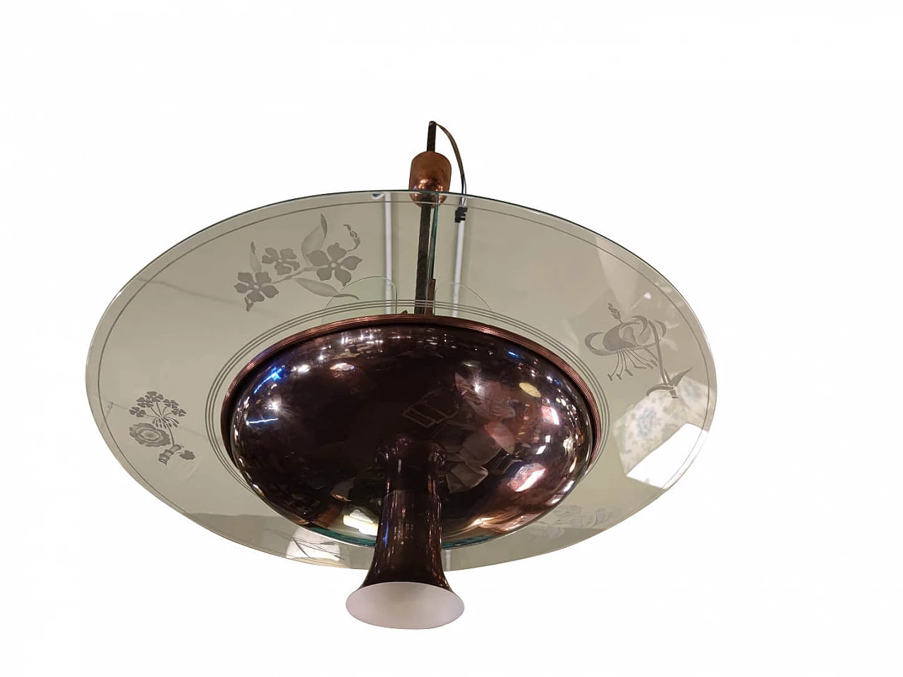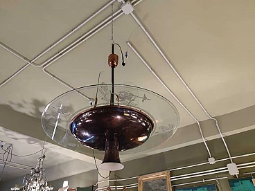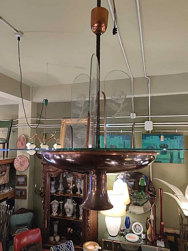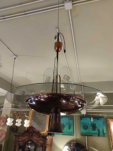 Lampadario in rame e vetro inciso di Pietro Chiesa per Fontana Arte, anni '40