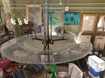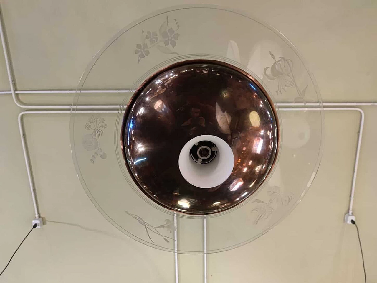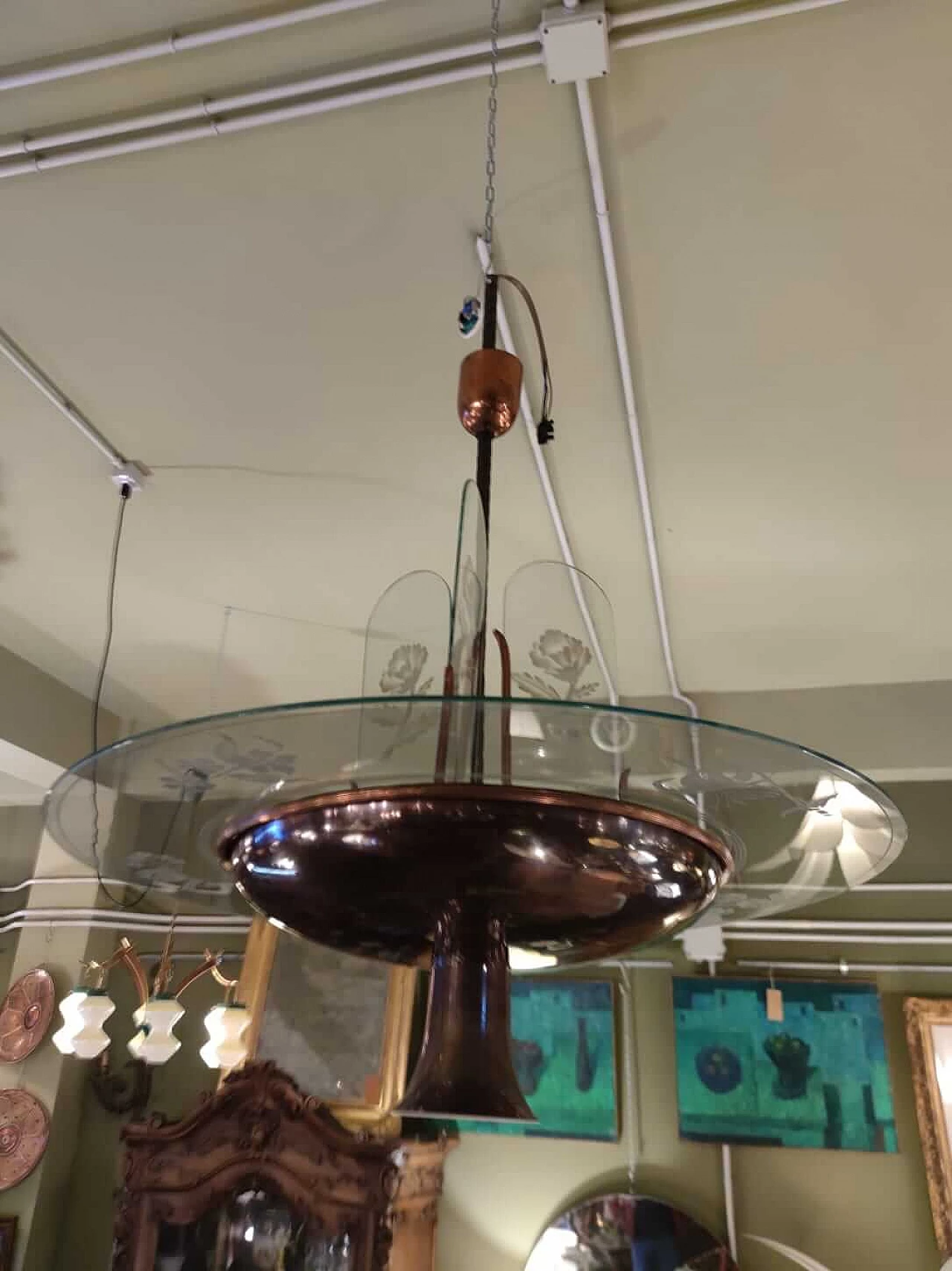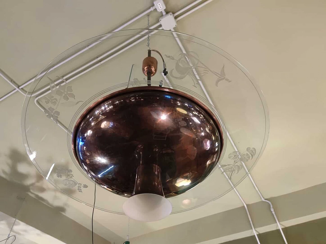 Lampadario in rame e vetro inciso di Pietro Chiesa per Fontana Arte, anni '40
