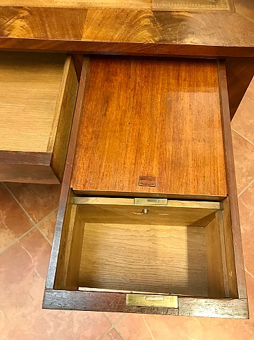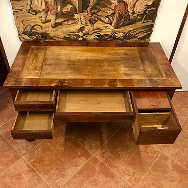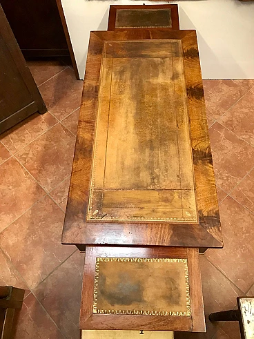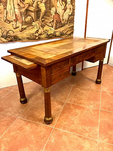 Elegante Tavolo Scrittoio di stile ed epoca Impero, prima metà '800, lastronato in piuma di Mogano e interni in Rovere di Slavonia con 4 gambe a colonna con Bronzi dorati poggianti su piedi a semisfera ognuno indipendente (e non raccordati tra di loro da una crociera come si vede abitualmente) e quindi più eleganti. Finito da centro, ha nella facciata 4 cassetti con serratura (anche se sembrerebbero 5): uno grande al centro, due piccoli sulla sinistra e uno doppio in altezza sulla destra con all’interno un ulteriore vano con coperchio scorrevole e serratura. Ai lati due tiretti retrattili che si possono allungare fino a 30cm. ciascuno ricoperto, all’interno di una fascia, in pelle bordata da una greca in oro zecchino; stessa lavorazione il piano principale, con l’aggiunta della piuma di mogano sulla fascia e di 4 palmette all’interno degli angoli della greca dorata racchiusa da un’ulteriore greca bulinata. Lo stato di conservazione è molto buono, la struttura è sana e ferma, la patina volendo necessita di un’ulteriore lucidatura, la serrature tutte presenti, la doratura dei bronzi molto bella. Presenti alcuni piccoli segni del tempo.