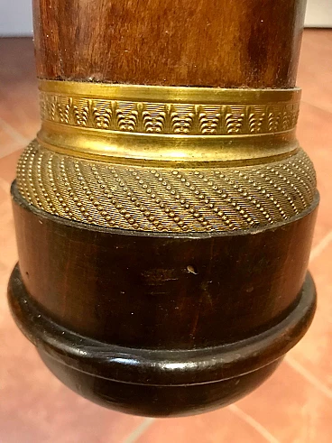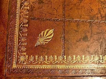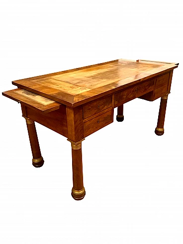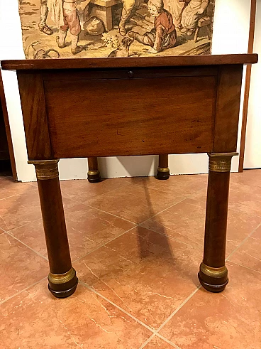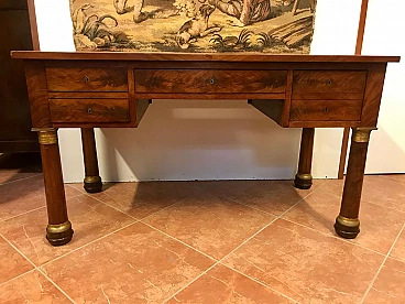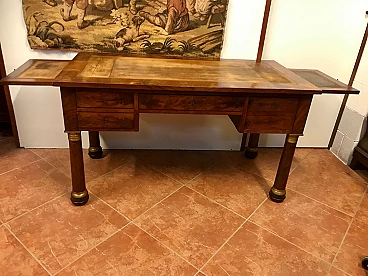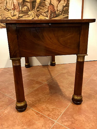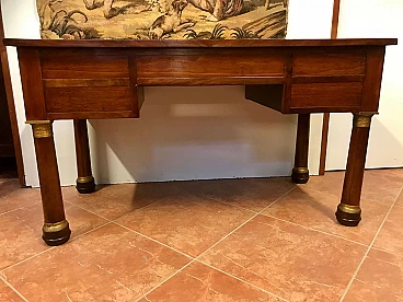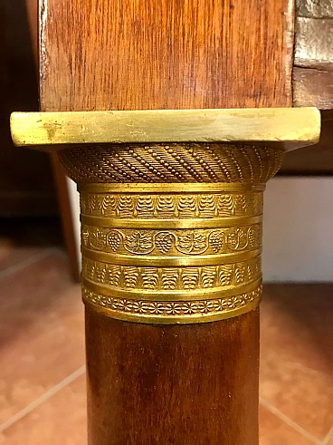 Tavolo Scrittoio Impero a colonne con bronzi dorati in piuma di mogano, piano e tiretti rivestiti in pelle, originale primi '800