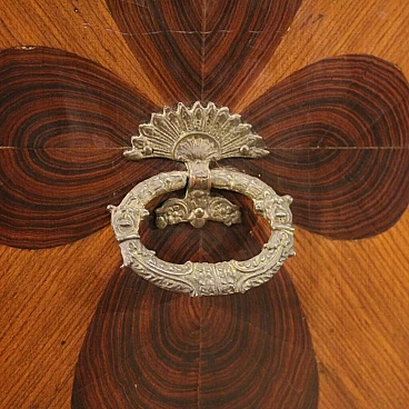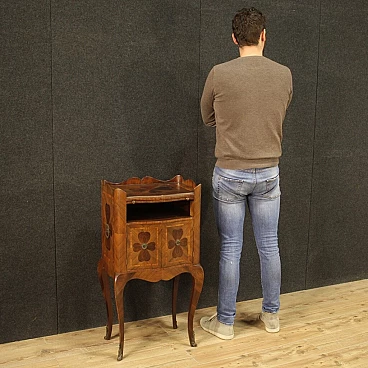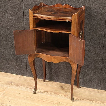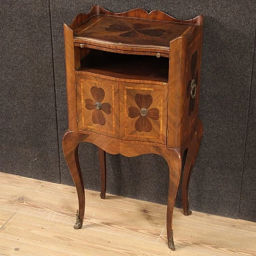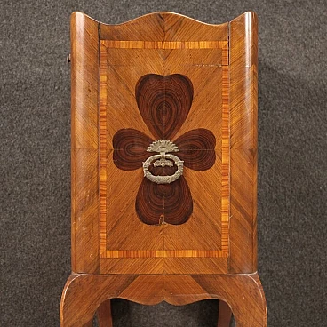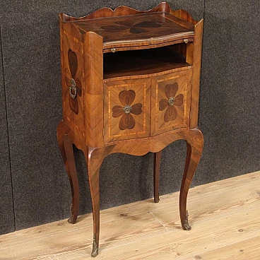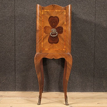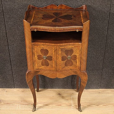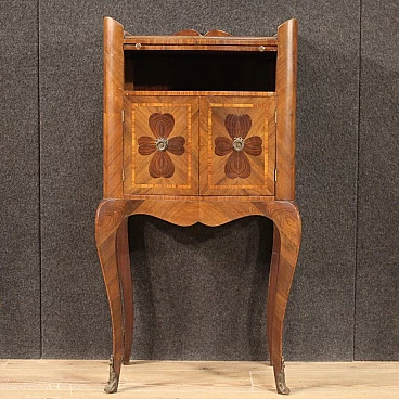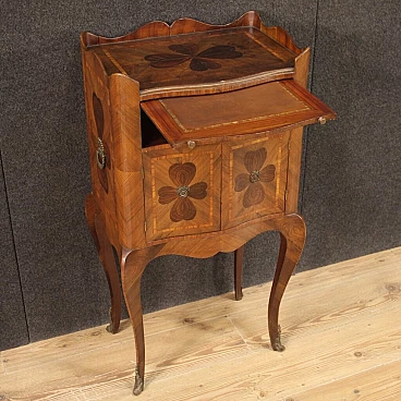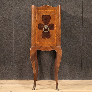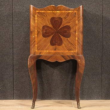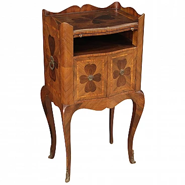 Comodino genovese della seconda metà del XX secolo. Mobile intarsiato e impiallacciato in legni di noce, bois de rose, mogano e palissandro adornato da maniglie laterali e frontali in metallo cesellato. Tavolino finito da centro munito di due antine frontali, un vano a giorno e un piano estraibile rivestito in finta pelle cesellata e dorata di buona misura e servizio. Mobiletto da soggiorno sostenuto da quattro solide gambe mosse di buona stabilità. Mobile per antiquari e arredatori adornato da quadrifogli su fronte, retro, piano e fianchi (vedi foto). Strutturalmente sano, presenta piccoli segni del tempo e una fessura nella parte superiore del retro (sopra il quadrifoglio, vedi foto). Nel complesso in buono stato conservativo.