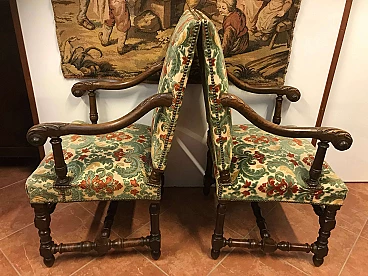 Bella ed importante coppia di Poltrone a Rocchetto di fattura Torinese di stile Luigi XIII e di epoca primi '800 in noce massiccio con seduta e schienale imbottiti e rivestiti con un bel tessuto. Sui braccioli presenti delle foglie d’acanto scolpite. Lo stato di conservazione,vista l’epoca, è ottimo, con la struttura sana e la patina ancora bella, con alcuni piccoli segni del tempo; l’imbottitura è ancora buona e la stoffa impeccabile fa pensare che siano state usate poco. Altezza seduta 50cm. circa