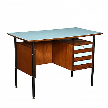 Scrivania con cassetti, legno impiallacciato mogano, formica, struttura in metallo smaltato.
