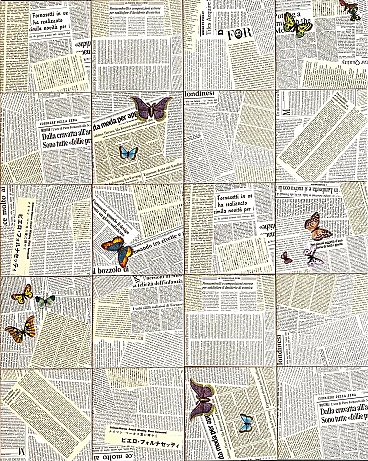 Pannello con 20 piastrelle della serie Ultime Notizie di Piero Fornasetti per la Ceramica Bardelli, 1953. Piastrella singola: 20 x 20 cm. Letteratura: Fornasetti - Una Follia pratica, Patrick Mauriès.