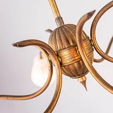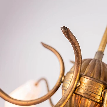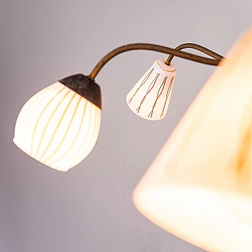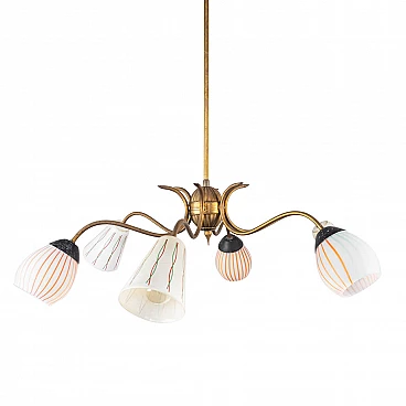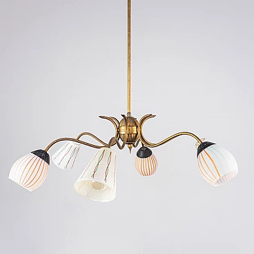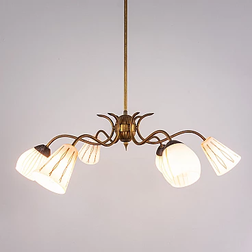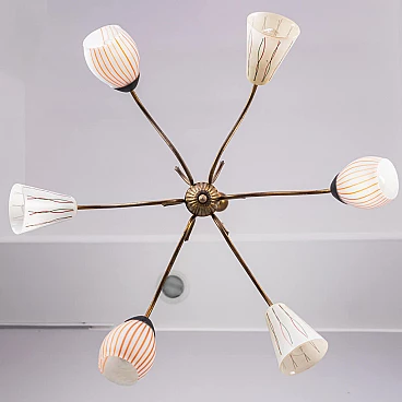 Lampadario a 6 luci in ottone e vetro opalino, anni '50