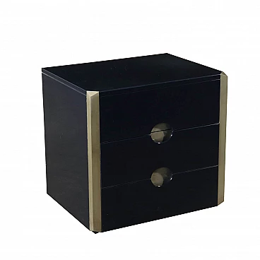 Piccolo mobile a cassetti, legno laccato con profili e particolari in metallo cromato.