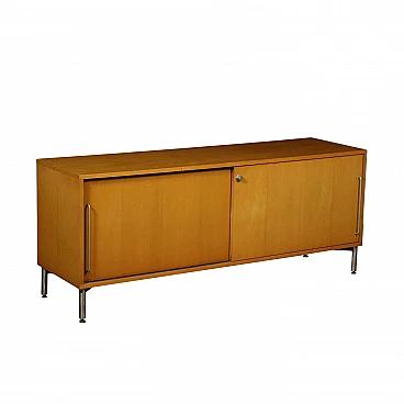 Credenza ad ante scorrevoli in legno impiallacciato acero e maniglie e base in metallo cromato. Prodotto in buone condizioni, presenta piccoli segni di usura. Il prodotto può essere rifatto da laboratori, secondo i gusti e le esigenze del cliente.