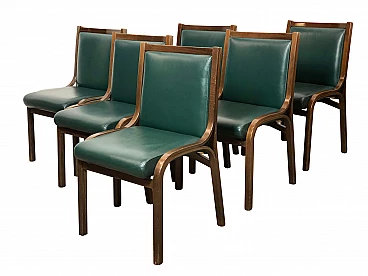 Set di 6 sedie Cavour produzione FRAU. Le sedie sono di manifattura italiana prodotte da Frau e disegnate da Lodovico Meneghetti, Giotto Stoppino e Vittorio Gregotti negli anni 60. Realizzate con una struttura in Noce lamellare, seduta e schienale imbottita in materiale espanso con copertura in pelle di colore verde ministeriale. Le sedie sono state completamente rimessa a colla e sanificate, presenti alcuni piccoli segni sulla struttura lignea causati dal tempo. La sedia partecipò nel Marzo 1960 alla storica mostra "Nuovi Disegni per il mobile Italiano" con relativa segnalazione al Compasso D'Oro. Repertorio: Giuliana Gramigna Pag.155. Condizioni perfette. Altezza seduta cm 45
