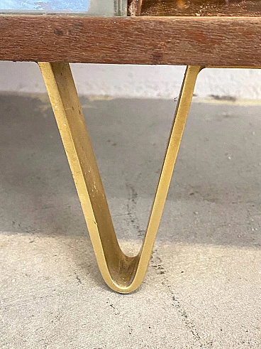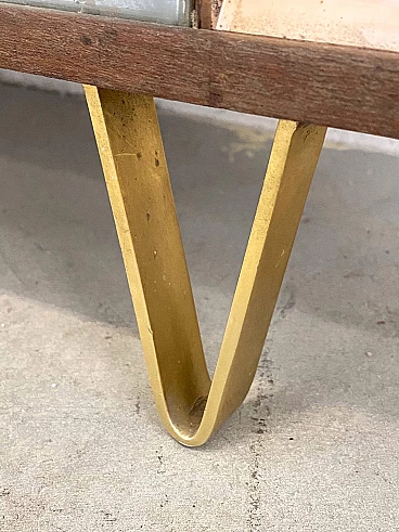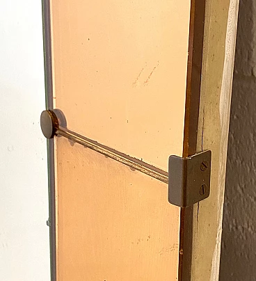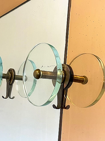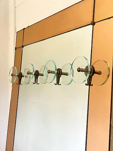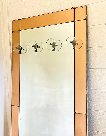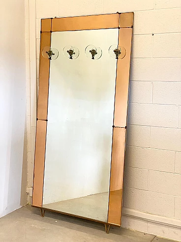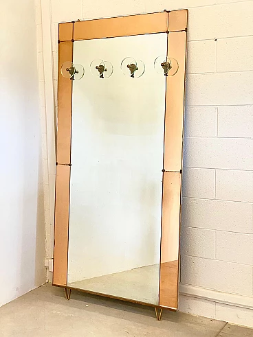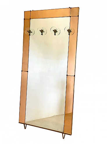Specchiera con appendiabiti anni '60 di Cristal Art. Specchio centrale incorniciato da vetri specchiati color salmone, piedi e ferramenta in ottone.