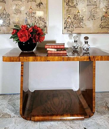 Originale e prezioso tavolo austriaco in radica di noce, è stato realizzato tra il 1929 e il 1932 in una piccola falegnameria di Abtenau, cittadina austriaca nel distretto di Hallein vicino a Salisburgo. Molto particolare è l'intera struttura del tavolo, i due pannelli laterali che sostengono il piano sono elegantemente collegati nella parte inferiore ad una base veramente originale ed unica, raramente abbiamo trovato questa ingegnosa e sofisticata soluzione in altri tavoli simili, bello ed affascinante è il piano realizzato in radica di noce di eccezionale qualità, qualità esaltata da una lavorazione unica e particolare: la lastronatura. Questa tecnica ha permesso di esaltare i colori e la fiammatura della radica di noce donando a questo tavolo un'eleganza e una raffinatezza unica ed esclusiva. L'oggetto è stato trattato a mano con antiche tecniche di restauro da un team di artigiani ed è in ottime condizioni.
