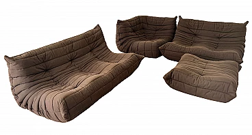 Salotto modulare a quattro elementi modello Togo. Struttura in poliuretano espanso rivestito in tessuto. Etichetta "Ligne Roset" su ogni elemento, ottime condizioni, nessuno strappo, lievi macchie, tessuto sfoderabile e lavabile. Angolare cm 72x100x100 Due posti cm 72x128x106 Tre posti cm 77x174x106 Poggiapiedi cm 88x98x35