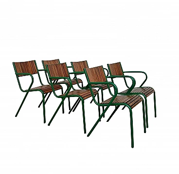 Manifattura italiana, 6 sedie impilabili con sedile e schienale in ferro e listelli di legno. Ottime condizioni, usate con segni di invecchiamento e usura.