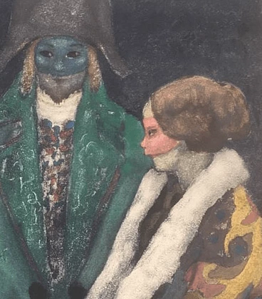 Da un profondo notturno emergono due figure. Un uomo in piedi al centro della composizione veste in un colorato abbigliamento settecentesco, le mani guantate appoggiate sui fianchi, una maschera copre gran parte del viso caratterizzato da occhi neri e profondi. La donna, a destra, è seduta di profilo, ha i capelli raccolti e una maschera rosa su un volto tinto di bianco, indossa un cappotto molto colorato che ricorda l’abito tradizionale di Arlecchino. Un silenzio complice avvolge la scena.