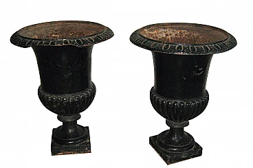 Coppia di vasi in ghisa di inizio '900. Modello mediceo. Buono stato generale, il bordo superiore presenta piccole mancanze. Pitturati in verde scuro. La base misura cm. 21 x 21