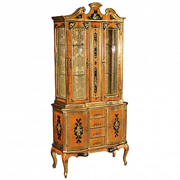 Vetrina toscana del XX secolo. Mobile doppio corpo, mosso e bombato, riccamente cesellato, laccato, dorato e dipinto a mano. Credenza con alzata munita di 2 ante e 4 cassetti centrali di buona capacità. Corpo superiore a 2 ante, completo di chiavi funzionanti, munito di 2 ripiani interni in vetro di buon servizio (vedi foto), ideale per esporre collezioni di oggettistica. Interno rivestito in tessuto damascato con qualche piccolo segno di usura. Vetrina adornata da vetri frontali e laterali dipinti (vedi foto). In buone condizioni e in bella patina.