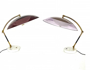 Coppia di mod. Orleans lampade da tavolo a cupola, paralume a cupola in perspex viola leggermente affumicato. Stilux, Milano Italia, 1955 Marmo di Carrara, ottone, acrilico braccio articolato con due giunti regolabili. Rif.: Catalogo di produzione Stilux Milano. Condizioni molto buone, coerenti con l'età e l'uso, graffi appena visibili su un paralume.