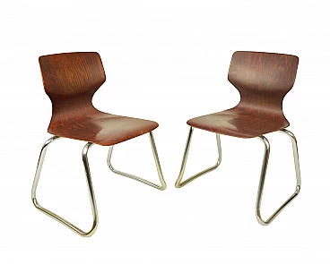Un paio di sedie per bambini disegnate da Adam Stegner negli anni Settanta per Elmar Flototto. Sedute in compensato di palissandro piegato, montate su telai cromati a forma di pattino. Buone condizioni, visibili segni d'uso.