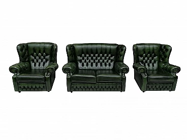 Set chesterfield modello Monk, composto da una coppia di poltrone e da un divano due posti, inglese originale in pelle verde anticato. Chesterfield di eccezionale qualità costruttiva realizzati con scrupolosa attenzione per i dettagli. Dimensioni divano : L 145 P 90 A 100 cm Dimensioni poltrona : L 95 P 90 A 100 cm. Di recente costruzione sono rifiniti in pelle bovina di pieno fiore accuratamente lavorata per risultare resistente nel tempo e morbida al tatto. Lo stato di conservazione è ottimo. Si rilascia certificato di autenticità.