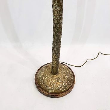 La base della lampada da terra è in legno di quercia circolare, che ospita la piastra principale in ottone. Questa è decorata in ottone sbalzato e raffigura un pavimento a foglie, da cui sporge un elegante tronco reticolato in ottone curvato, che porta alle foglie di palma in ottone simili a fontanelle. Queste foglie dorate hanno nascoste al loro interno quattro luci, che creano un bagliore incredibile quando sono accese.