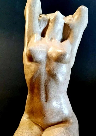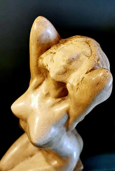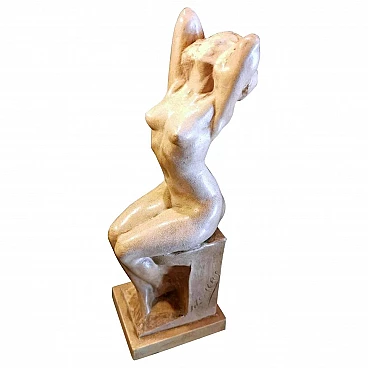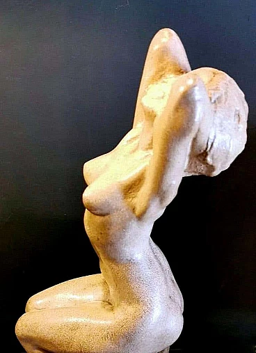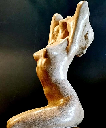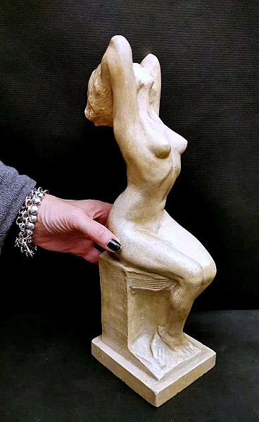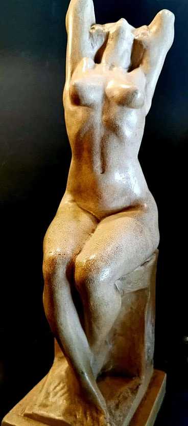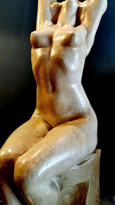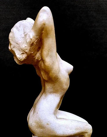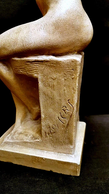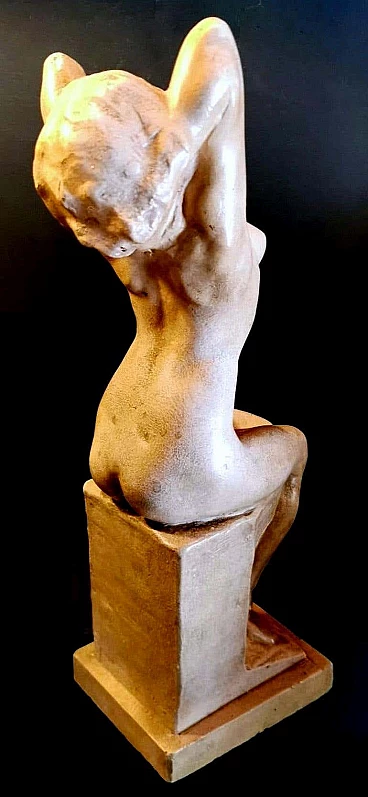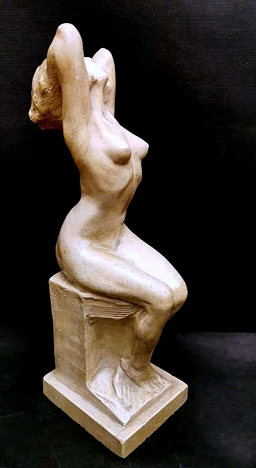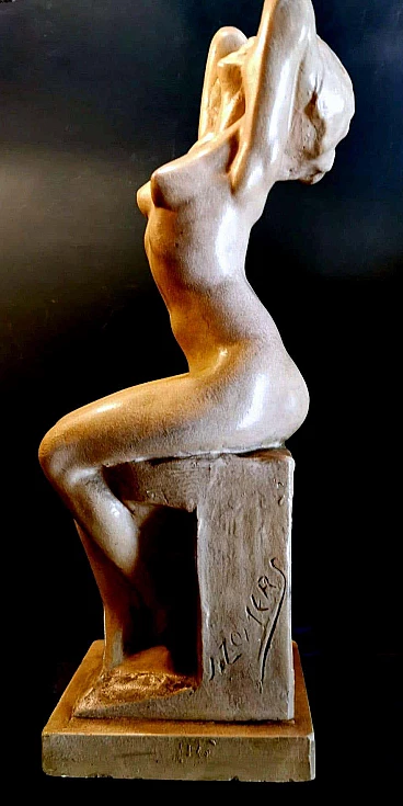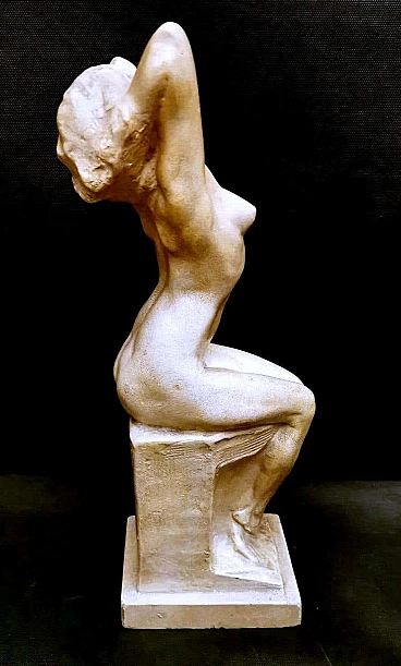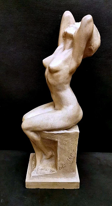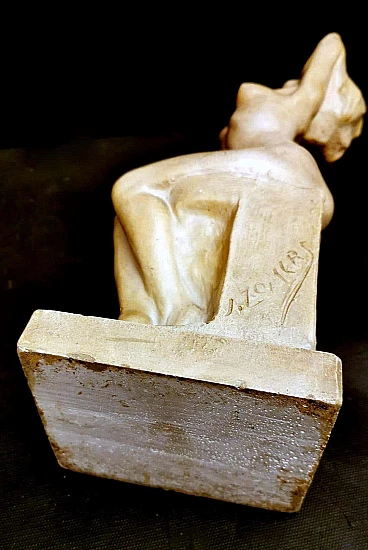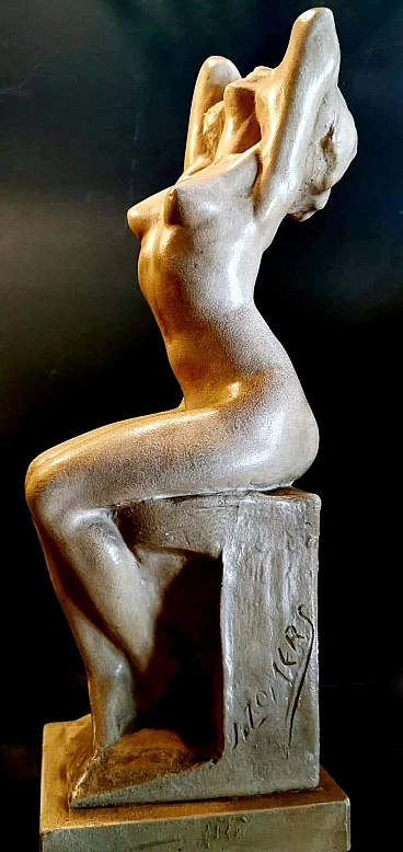 Statuetta di una donna nuda seduta, in gesso di Parigi patinato (il gesso di Parigi è un materiale molto resistente, usato fin dall'antichità, era usato dagli antichi egizi come legante nella costruzione delle piramidi e viene usato in scultura per la sua forza). La statua è un'opera del famoso scultore e bronzista belga Joseph Zomers che la eseguì tra il 1915 e il 1920 e la cui firma si trova sul piedistallo. È un oggetto in perfetto stile Art Nouveau (Jugendstil). Joseph Zomers nacque a Liegi in Belgio nel 1895 e morì nel 1928, studiò arte a Maredsous (Belgio), molte delle sue opere sono esposte in permanenza al Museo di Liegi.