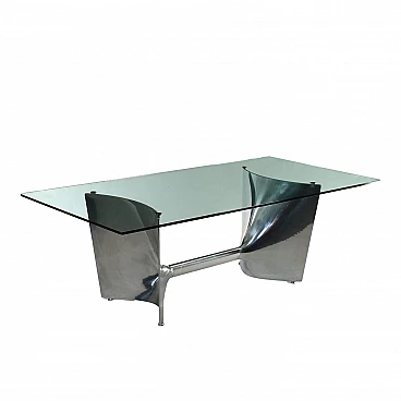 Tavolo con base in fusione di alluminio cromato e piano in vetro. In buone condizioni, presenta piccoli segni di usura.
