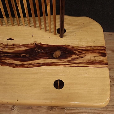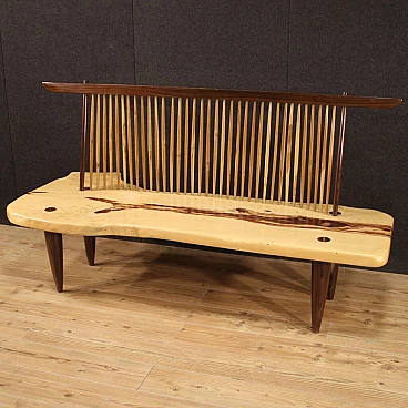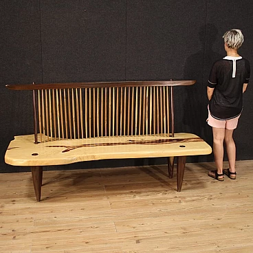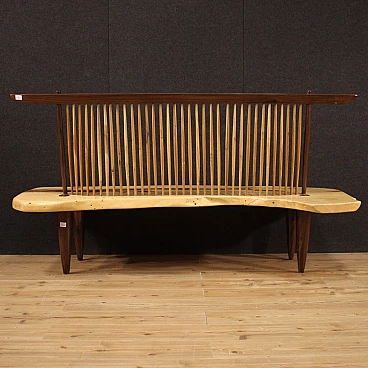 Divano di design in stile George Nakashima della fine del XX secolo. Mobile scolpito in legni di noce e legno esotico della celebre linea del designer/architetto americano. Riproduzione di ottima qualità con caratteristiche simili all'originale se non per la presenza degli inserti passanti delle gambe sulla seduta (vedi foto). Favoloso schienale ad anfiteatro con supporti lignei senza rotture (vedi foto). Mobile per antiquari e arredatori, ideale per un uso interno, dal peso considerevole e di ottima solidità. Presenta piccoli segni di usura, nel complesso in buono stato conservativo. Altezza alla seduta 48 cm.